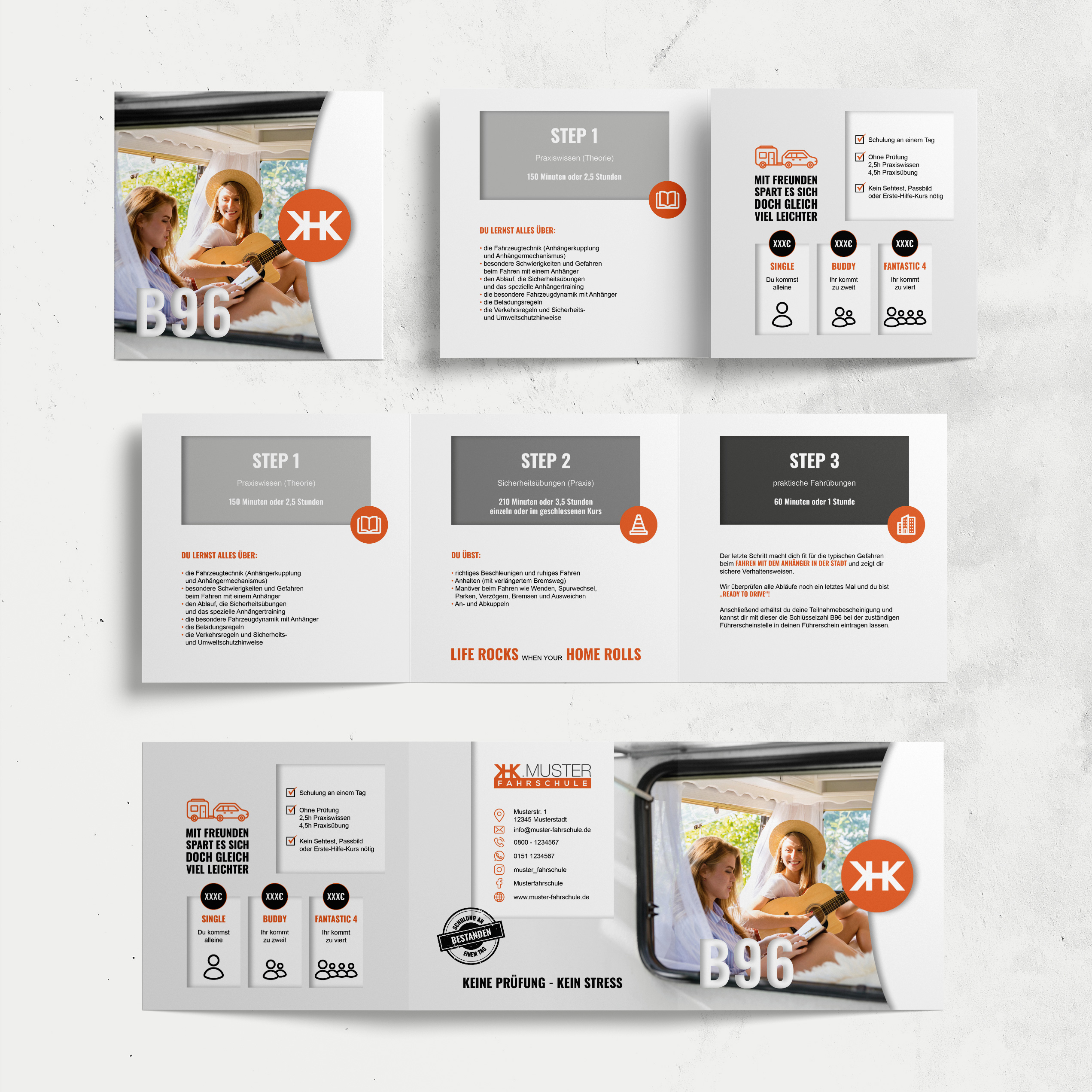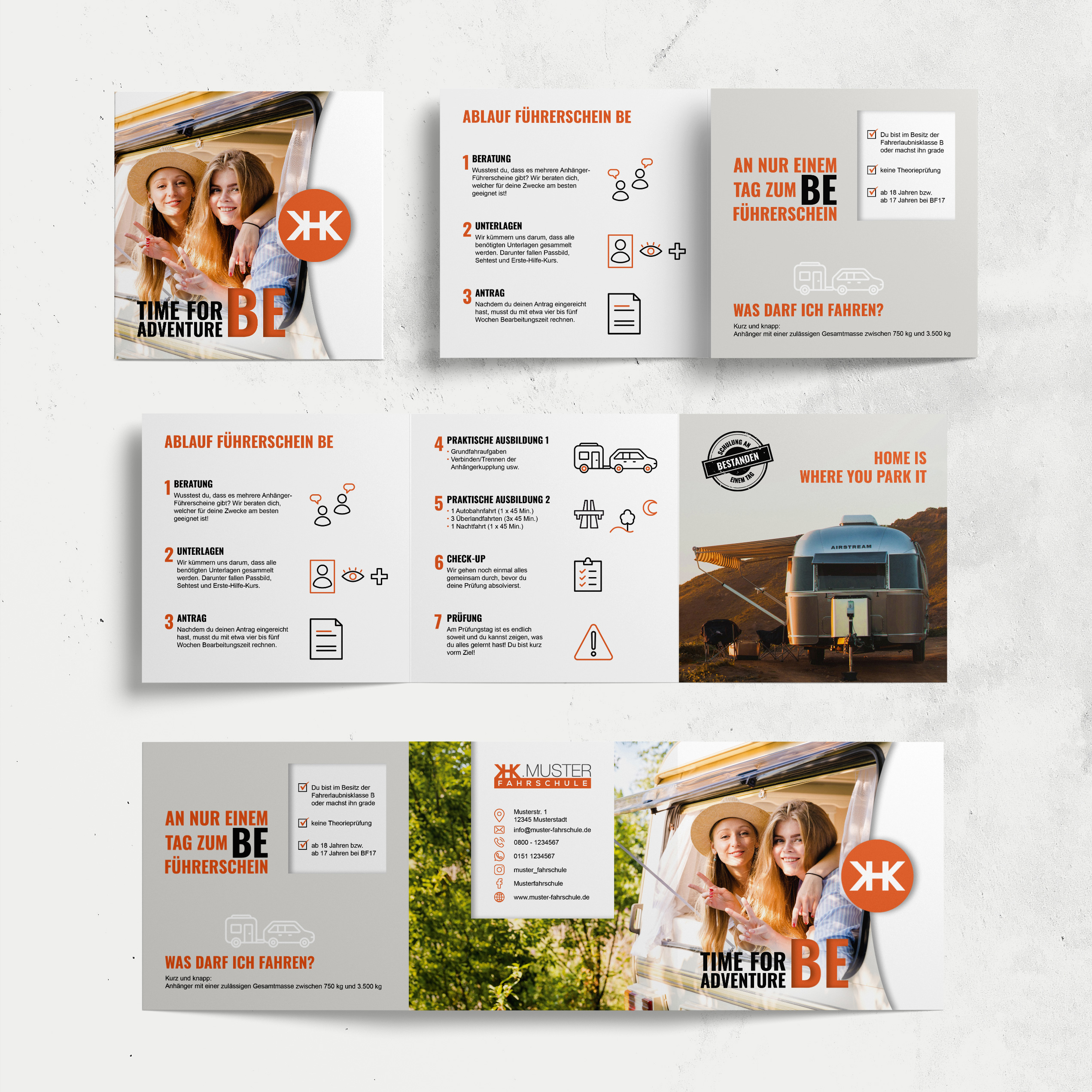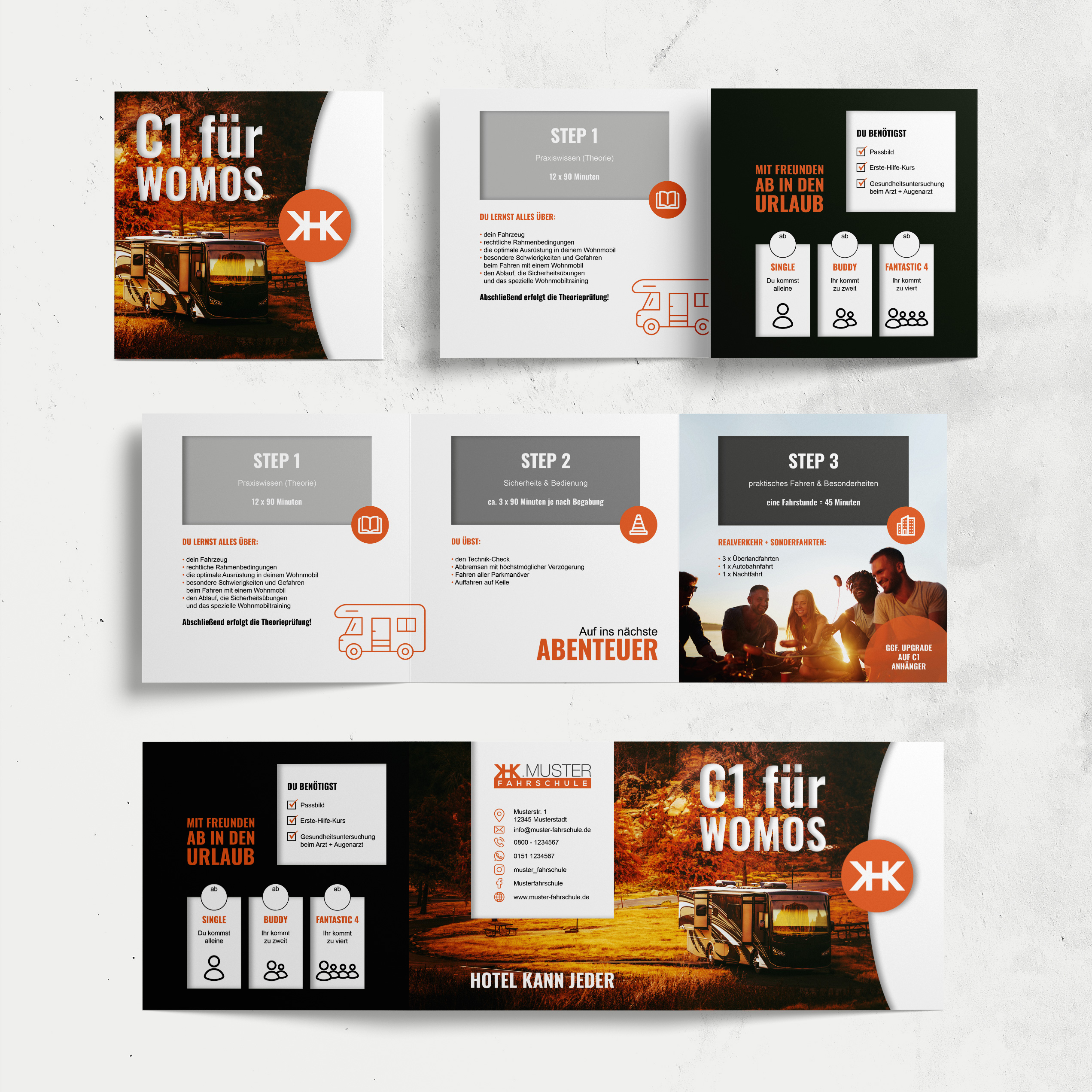 Wir haben dir hier Flyer zu B96, B196, B197, BE, C1 und Womo vorbereitet, welche mit deinem Logo und mit deiner Hausfarbe versehen werden.